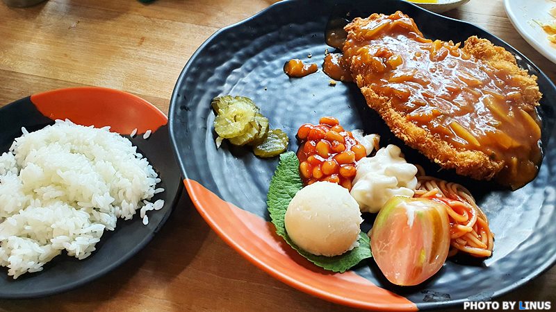 드디어 왕돈까스도 나왔다. 밥과 스파게티, 감자샐러드, 토마토 등의 곁들인 반찬과 함께 나온다.