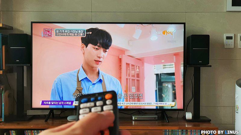TV를 켜고, 끄고, 모두 잘 작동한다. 스피커 상에서 음량 조절도 잘 된다.