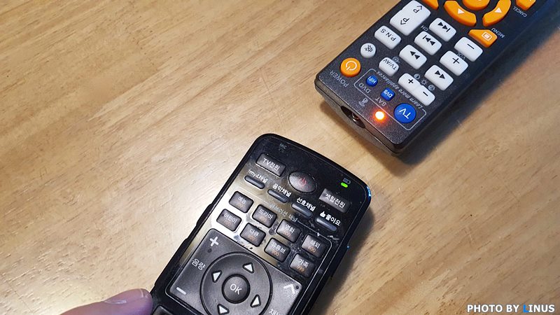 이때 복사하고자 하는 리모컨(LG 유플러스 셋톱박스 리모컨)과 머리와 머리를 맞대고 놓는다.