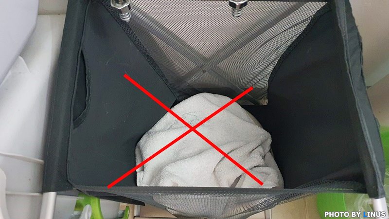 이렇게 세탁기나 빨래통 옆에 걸어서 말려주자. 세탁전이라도 이렇게 말려서 세탁을 하는 것과 그대로 젖은 채로 방치되었다가 세탁을 하는 것은 정말 큰 차이가 난다.