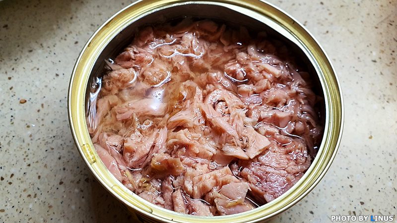 라이너스 씨는 보통 참치 통조림을 먹을 때 기름을 버리고 먹는 편인데... 이 요리는 식용류 없이 참치캔만으로 요리를 만드는데 의의가 있으니 참치캔의 기름을 프라이팬에 부어준다.