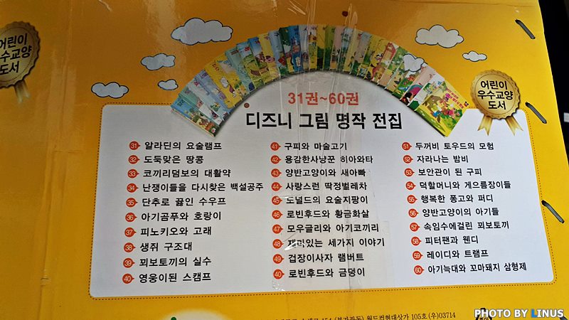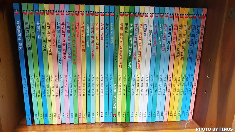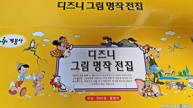 인터넷에서 구매한 전 60권의 올컬러(?) 디즈니 그림 명작 전집. 디즈니 그림 동화는 월트디즈니에서 그림형제의 그림동화를 바탕으로 각색해서 새롭게 창작한 2차 창작물이라고... 계몽사, 저 출판사 이름도 오랜만에 듣는다.^^;