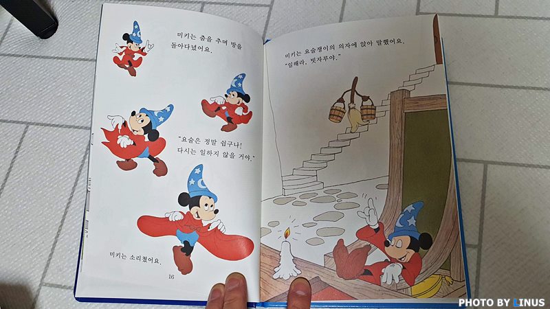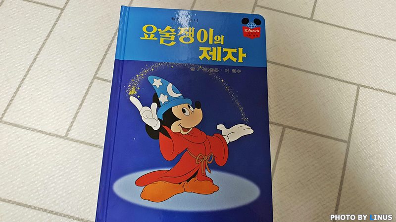 마법사의 제자인 미키마우스가 마법모자를 몰래 쓰고 마법을 부리다가 사고를 친다는 내용.ㅋ 당시 그림 그대로다. 듣기로는 원판이 남아있지않아 기존 책을 구해 사진을 찍어 일일이 그림 프로그램으로 수정했다고...