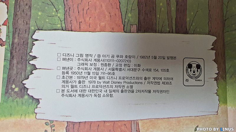 여기서 잠시 맨 뒤쪽을 보면... 계몽사에서 20년만에 이 책을 복간하려 했으나 월트디즈니 사는 저작권 계약을 해주지않았다고... 그래서 계몽사에서 법률사무소에 자문을 구한 결과, 저작권법에 의해 월트 디즈니 프로덕션즈의 저작권은 소멸되고 대한민국 내 2차저작물 저작권자인 계몽사가 이 책에 대한 저작 권리를 소유하고 있음을 확인했다고 한다. 대박!