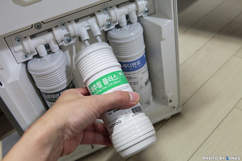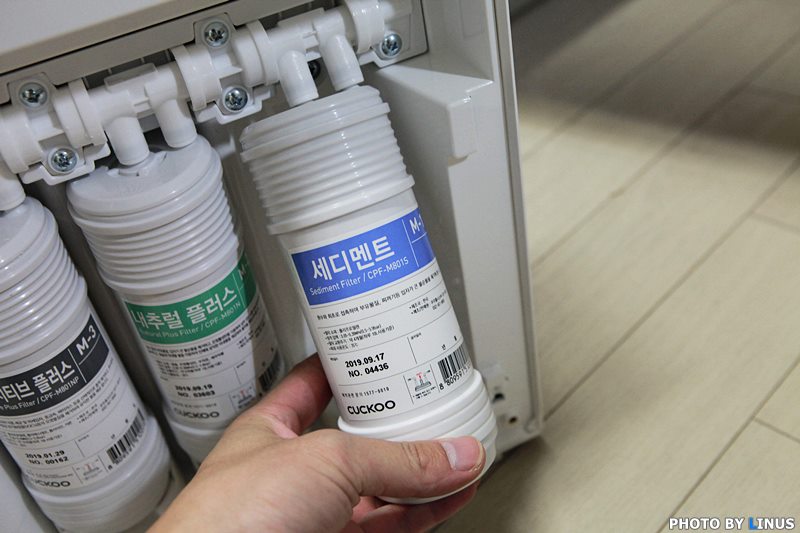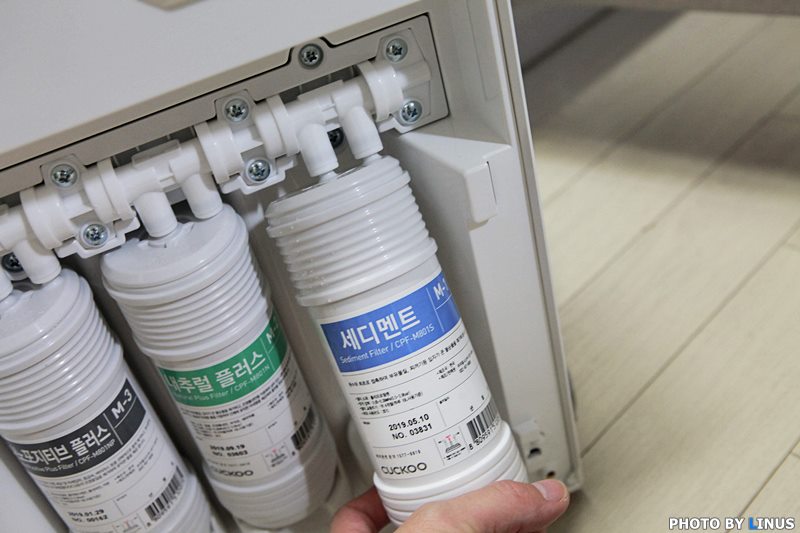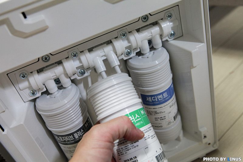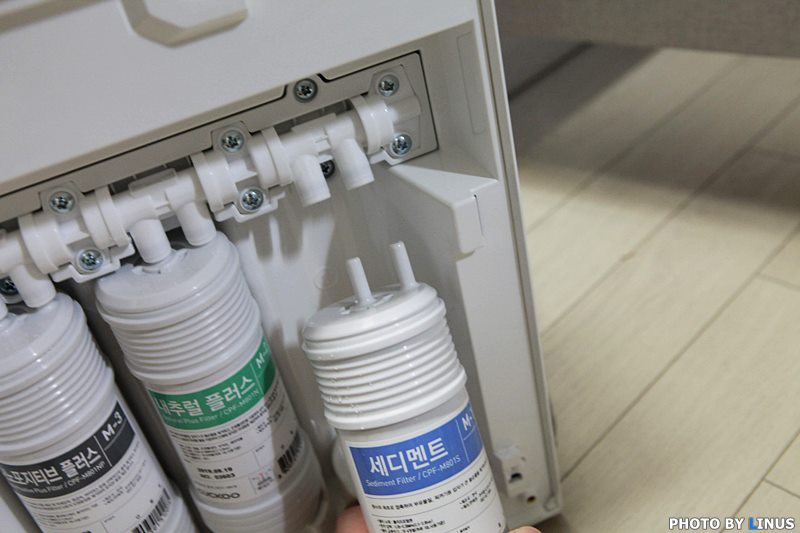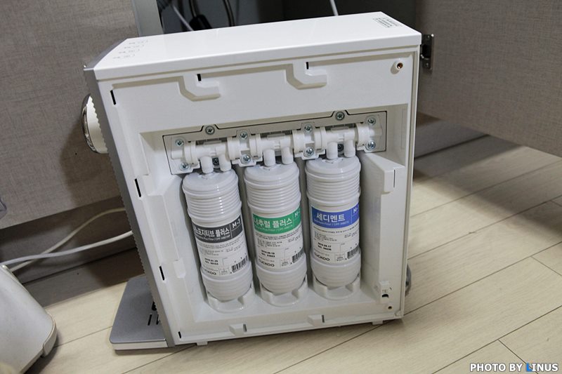정수기 내부의 모습. 나노포지티브 플러스, 내추럴 플러스, 세디먼트 등 총 3가지 형태의 필터가 보인다.