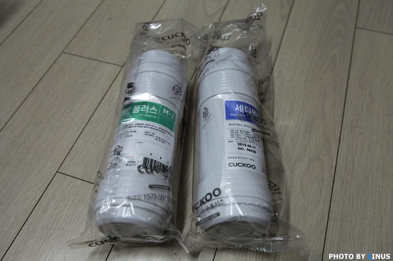 그리고... 쿠쿠에서 택배로 받은 쿠쿠 순정 필터. 각 필터의 교체 주기에 따라 다른 필터가 들어있다. 쿠쿠 서비스 센터에서 보통 4개월에서 6개월에 한번씩 필터를 보내온다. 신형 필터는 최소 6개월로 그 기간이 늘어났다고한다.