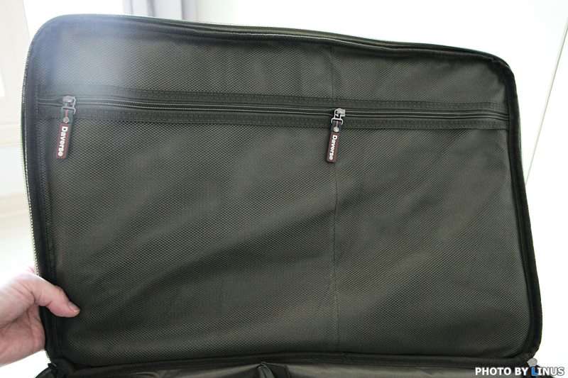 위쪽엔 메쉬망으로 된 수납 주머니가 있다. 내부 저장물이 잘 보인다. 라이너스 씨의 경우 쉽게 찾아야하는 랜턴이나 각종 충전기, 건전지 등을 저기다 넣고 다닌다.