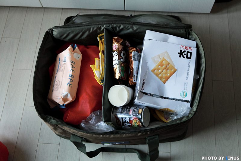 팩가방, 물티슈, 속옷, 갈아입을 옷, 라면 등 식자재, 부탄가스... 이것저것 가득 채워넣어도 잘 들어간다. 수납력 짱!