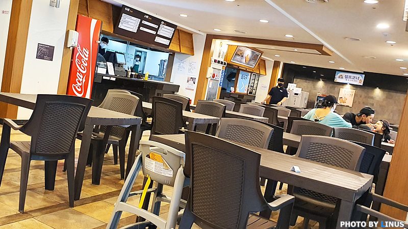 2층에는 푸트코트에는 식당과 카페가 마련되어있다. 사회적 거리두기를 위해 의자와 테이블도 띄엄띄엄 앉게 되어있다.