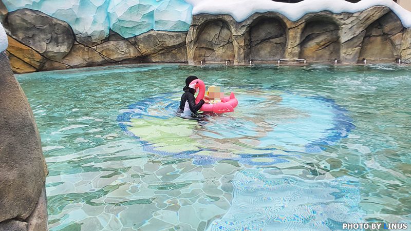 마스크를 쓰고 튜브와 구명조끼를 하고 즐거워보이는 아이들과 뭉이. 이곳에서는 수모나 머리를 감싸는 일반 캡 모자도 허용된다.