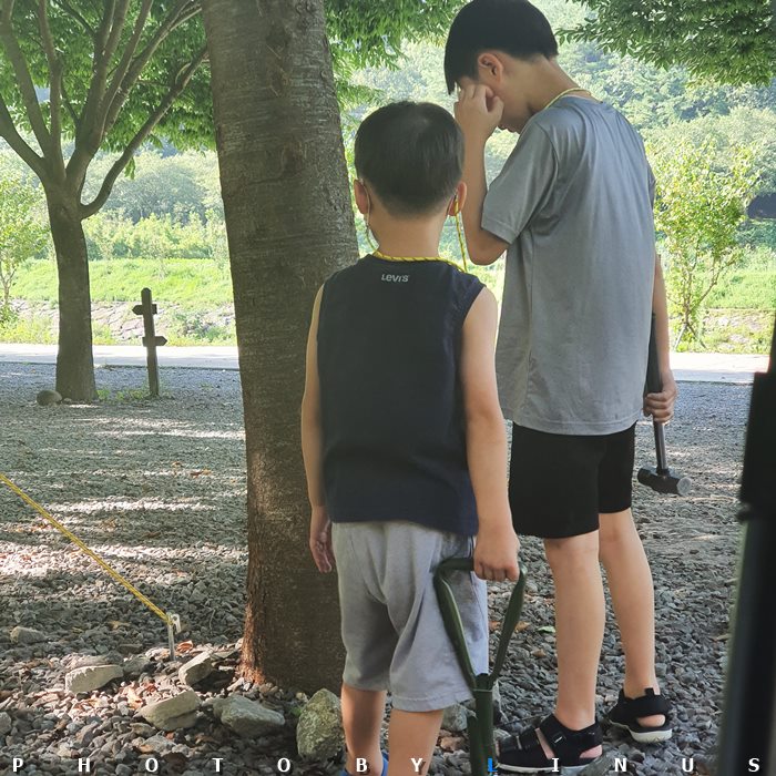 지난 주말 태풍이 지나갔던터라 기본적으로 물살이 센데다가 산청 댐에서 방류를 한다는 안내 방송까지.ㅠㅠ 결국 물놀이는 안드로메다로 날아가고 계곡 앞에서 아쉬움을 담은 돌 멀리 던지기 놀이하는 두녀석.