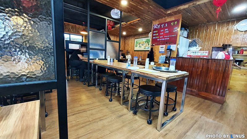 진양호짬뽕의 메뉴판. 메뉴 리스트를 보면 진양호짬뽕 9천원, 짬뽕밥 만원, 고추짬뽕 만원, 콩짜장 5500원, 고추짜장 6500원이며 곱빼기는 2000원이 추가된다고... 뭉이와 함께 짬뽕 하나와 콩짜장 하나를 주문해놓고 기다리며... '생각보다 사람이 많지는 않네'라고 말하는 순간 손님이 우르르... 11시20분쯤되니 자리가 거의 꽉 찼다. 어쨌거나 오늘은 날씨도 흐린 게 짬뽕이 딱 생각나는 날씨이기도 하다.^^;