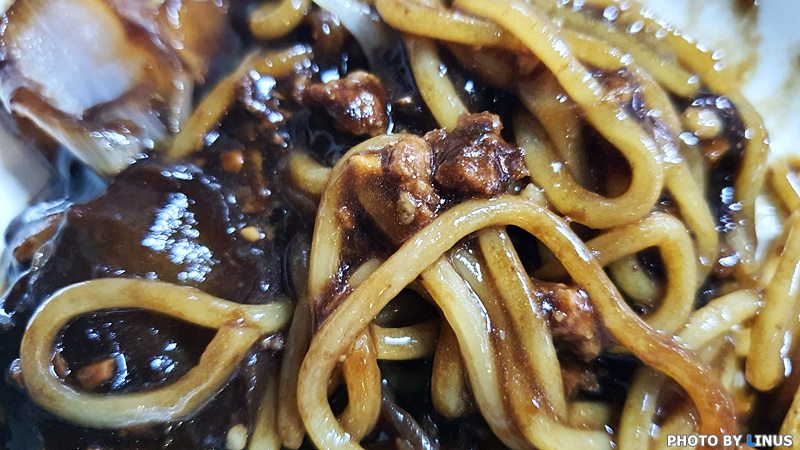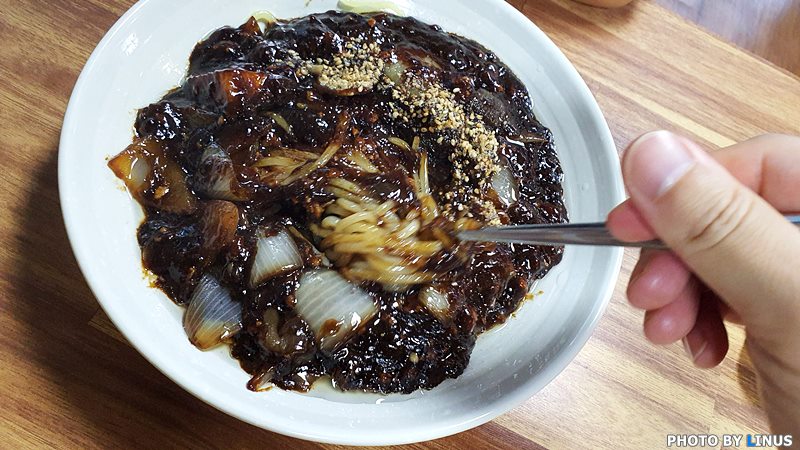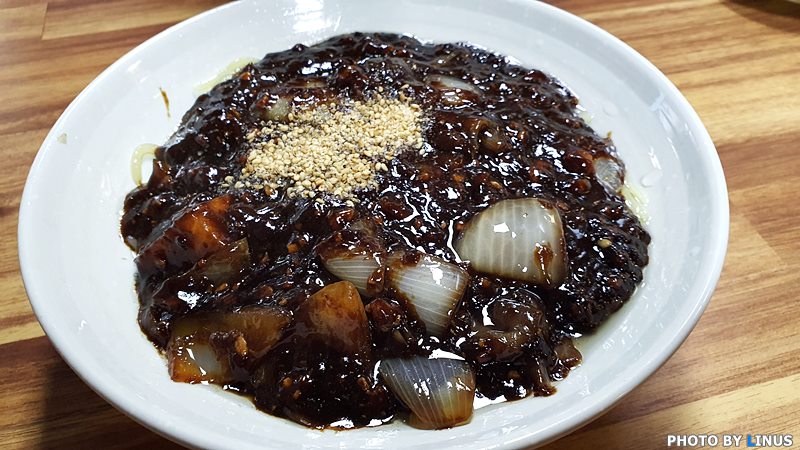 이제 콩짜장의 시간. 까만 짜장 위에 뿌려진 깨소금이 먹음직스러워보인다.