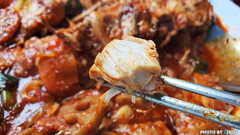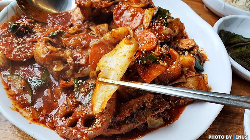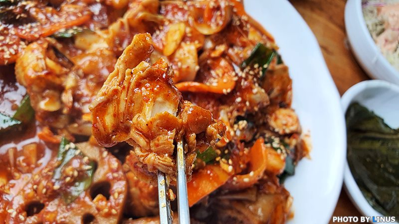 그리고... 드디어 대망의 매운연근닭찜이 나왔다. 타지역에서는 찜닭이라고 하는데 진주지역에선 닭찜이라고 한다. 이걸 바로 못먹고 침을 꼴깍거리면서 사진부터 찍어야하는 신세.ㅠㅠ;