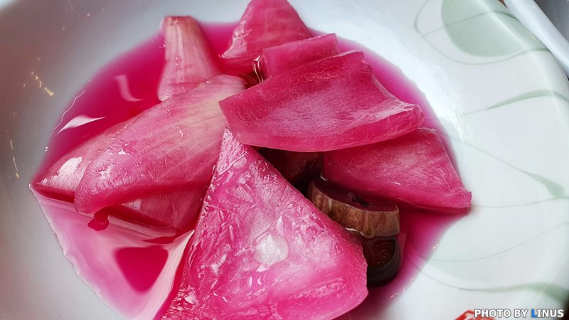 비트물을 입힌 피클, 양파 절임.