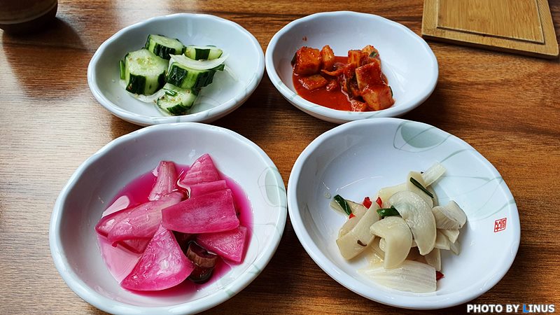 닭요리가 나오기 전에 먼저 나온 밑반찬. 오이, 깍두기, 버섯, 양파 비트 절임.