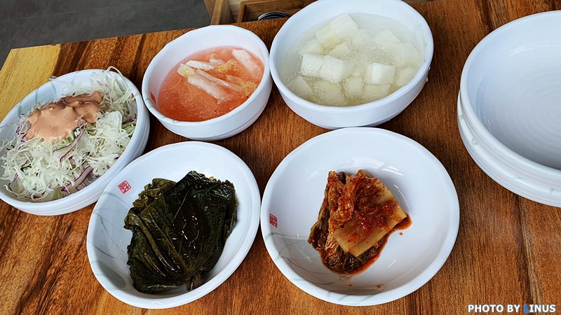 샐러드, 치킨무, 동치미, 김치 등등...