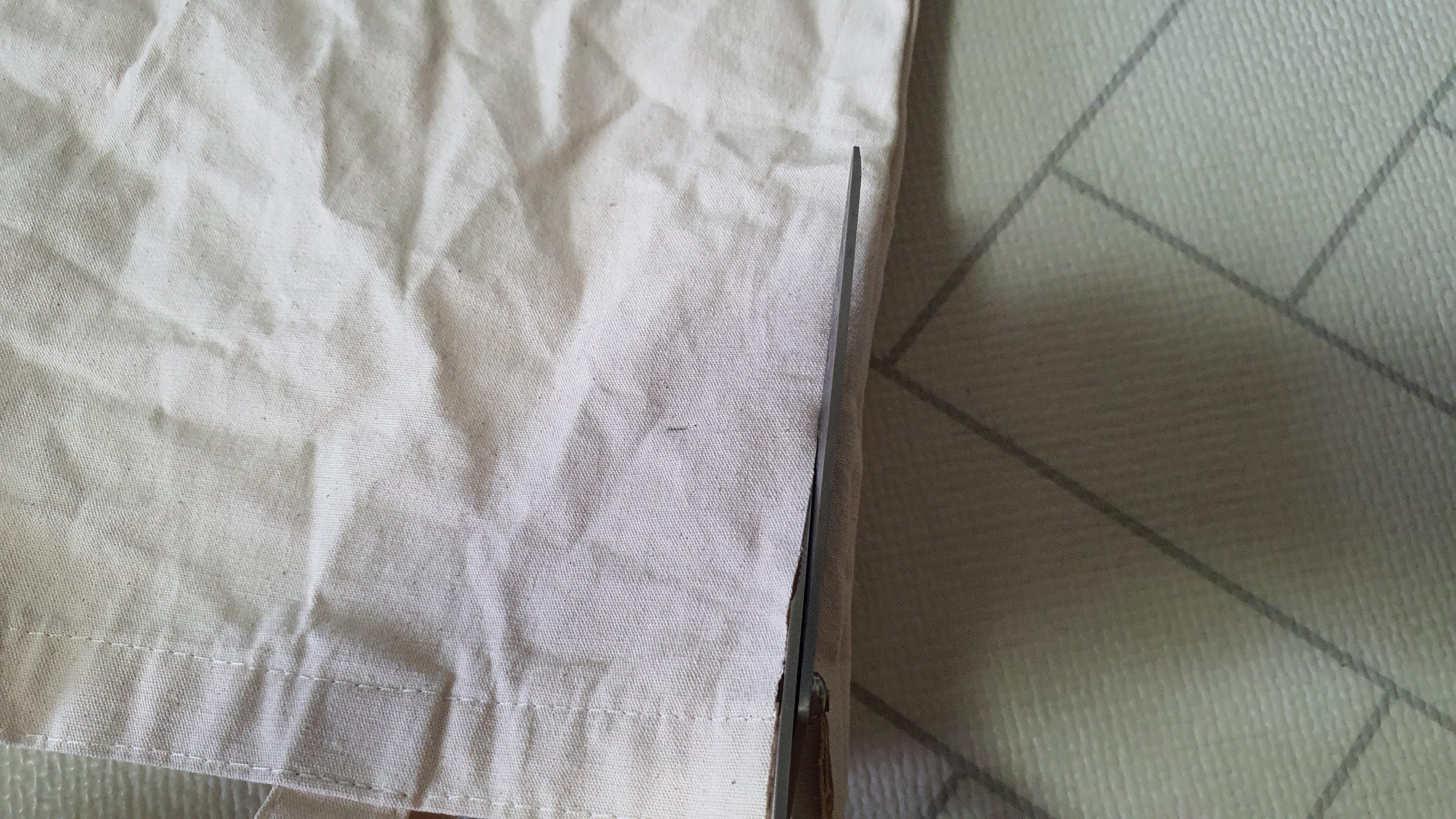 이렇게 에코백 손잡이 부분을 위에 남겨 두고 잘라야한다. 아래의 자른 부분은 올이 빠질 수 있으니 바느질을 해줘야한다.