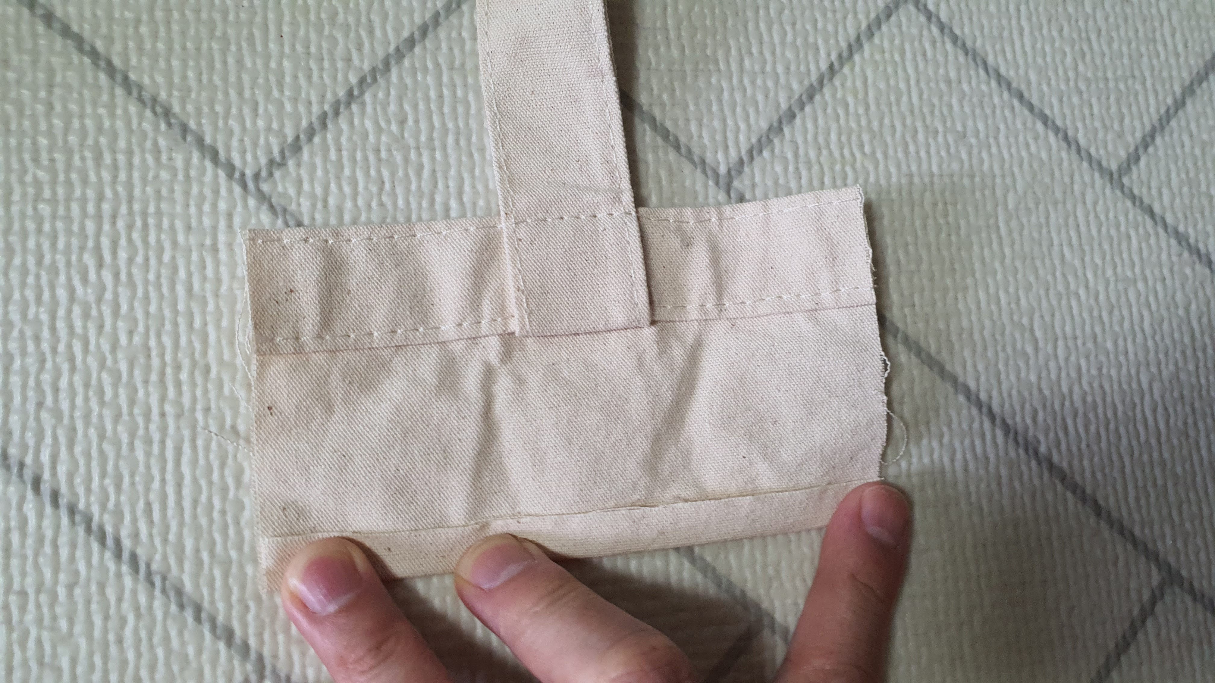 이제 에코백 손잡이 부분을 아래로 내려서 천의 몸통 부분을 가운데로해서 내려준다.