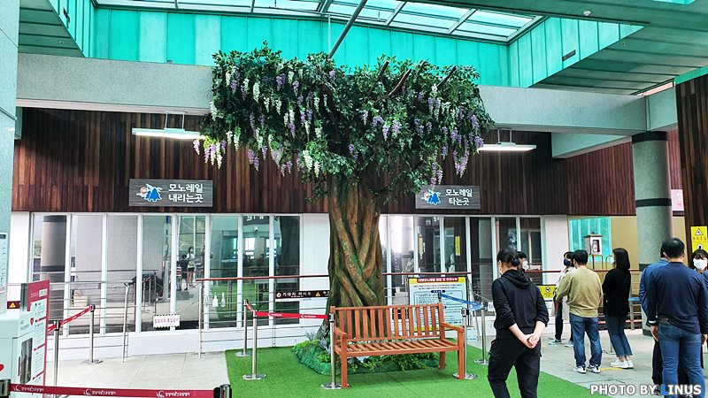 첫차는 오전 9시에 대봉휴양관에서 출발해서 모노레일 승강장에 도착한다음 모노레일에 탑승한다. 15분 간격으로 운행하고 총 32회차까지 운행한다고... 특이한게 매표소인 대봉휴양관에서 예매를 한다음 관광버스(?)같은 걸 타고 모노레일 승강장으로 올라가기에 모노레일 탑승시간 1시간전에는 주차장인 대봉휴양관에서 대기해야한다.