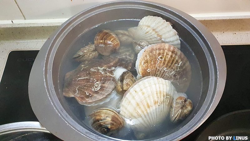 소금물에 가리비를 방치(?)해서 해감을 해준다. 이렇게 해감을 해주면 가리비가 가지고 있는 이물질을 토해낸다고...