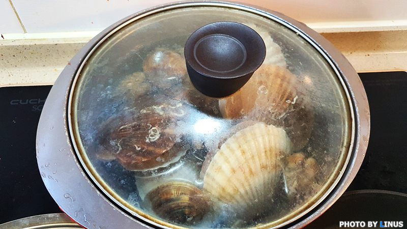 뚜껑을 닫고 삶아준다. 가리비의 삶는 시간은 약 10분정도. 삶는 시간이 너무 길어지면 가리비가 질겨지니 조심.^^;