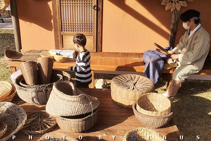 다양한 광주리들이 즐비하고... 뒤편으로 젊은 스태프 님이 하염없이 다듬이질을 하고있다.