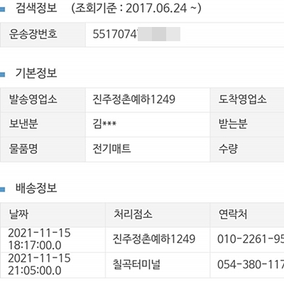 그리고 바로 다음날인 11월16일. 배송이 완료되었고... 16일날 매트연구소에서 AS처리해서 물건을 다시 보내시고 17일날 수리된 물건을 받아볼 수 있었다. 15,16,17일. 3일밖에 안걸린듯.^^ 그동안 텐트나 타프 등 중고거래할때 큰 물건은 택배사 접수가 어려워서 당근 어플에서만 거래했었는데 화물택배사를 이용하면 제법 먼거리도 중고거래가 가능할듯하다.^^;