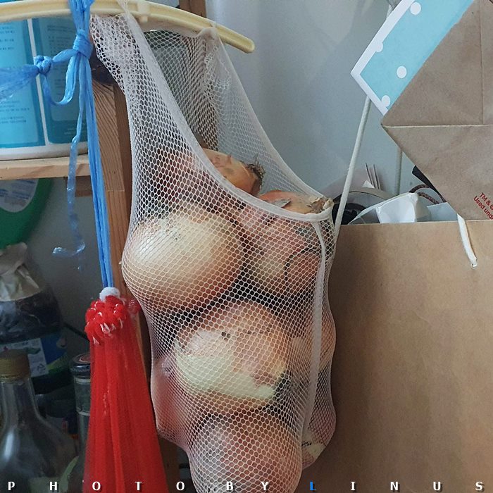 하지만 양파 양이 어느정도 많아지면... 이렇게 양파망에 넣어서 어딘가에 걸어서 보관하면 여름철이든 겨울철이든 양파가 잘 무르지도 상하지도 않고 오래 보관가능하다. 옆에 마늘도 비슷한 방식으로 마늘망에 보관중.ㅋ 하지만 라이너스 씨처럼 양파가 한 박스가 넘어가게 되면 양파망에 넣기도 곤란하다. 이럴땐...