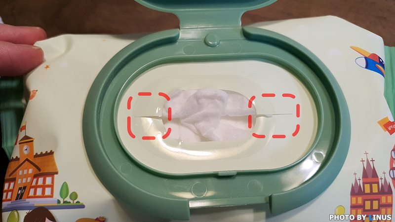 뚜껑을 닫아도 스티커가 붙은 뚜껑 윗부분과 아래 물티슈가 나오는 부분이 보다 밀착이 잘되어 물티슈가 마르는 현상이 확연히 줄어든다.