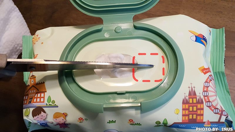 방법은 의외로 간단하다. 가위를 준비해서... 물티슈가 나오는 구멍 옆쪽을 조금 잘라주고...