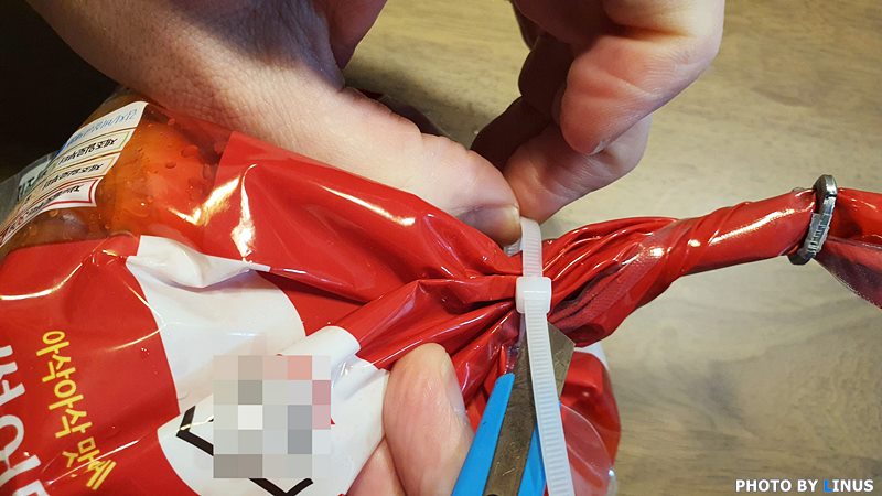 마트에서 김치를 사면 비닐봉지 안에 김치가 포장되어있고 위쪽은 혹시나 국물이 흐를까봐 케이블 타이로 한번 더 밀봉이 되어있다. 물론 국물이 흐르지않는것도 좋고 깔끔한 포장도 좋은데 단점은 역시 케이블타이를 푸는 게 어렵다는 것. 그렇다면 어떻게 하면 김치봉지의 케이블타이를 쉽고 깔끔하게 그것도 '재사용'가능하게 풀 수 있을까? 오늘은 친절한 라이너스 씨와 함께 알아보도록 하겠다.^^