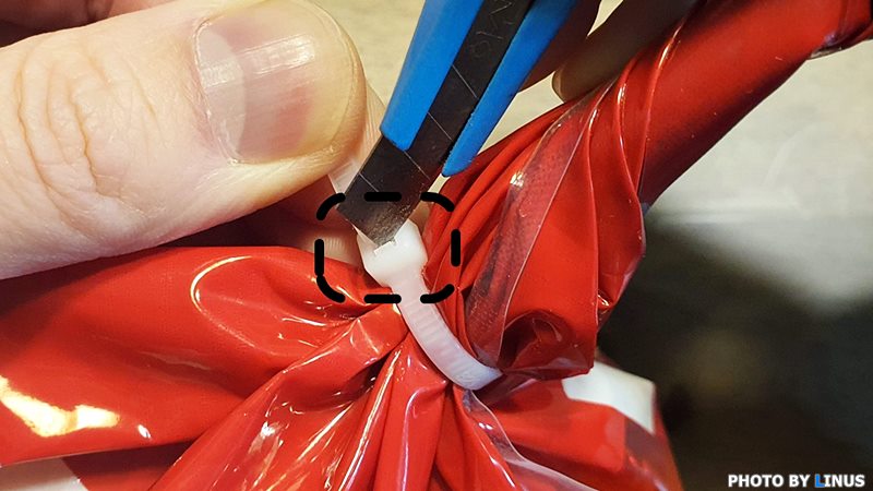 결국은 이렇게 봉지 자체를 잘라내는 방법밖에...ㅠㅠ 케이블타이도 그대로 쓰레기통으로 직행이다. 그렇다면 케이블타이와 비닐봉지에 손상을 입히지않고 깔끔하게 제거하는 방법은 없을까?