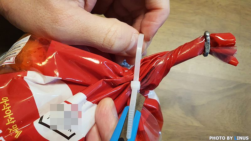 마트에서 김치를 사면 비닐봉지 안에 김치가 포장되어있고 위쪽은 혹시나 국물이 흐를까봐 케이블 타이로 한번 더 밀봉이 되어있다. 물론 국물이 흐르지않는것도 좋고 깔끔한 포장도 좋은데 단점은 역시 케이블타이를 푸는 게 어렵다는 것. 그렇다면 어떻게 하면 김치봉지의 케이블타이를 쉽고 깔끔하게 그것도 '재사용'가능하게 풀 수 있을까? 오늘은 친절한 라이너스 씨와 함께 알아보도록 하겠다.^^