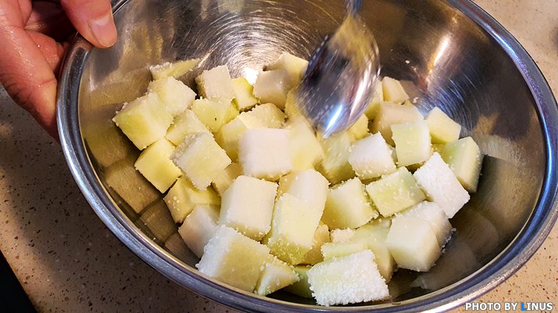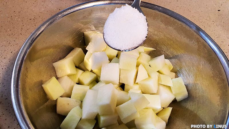 소금이 잘 묻은 무. 이제 이렇게 1시간을 절여둔다.