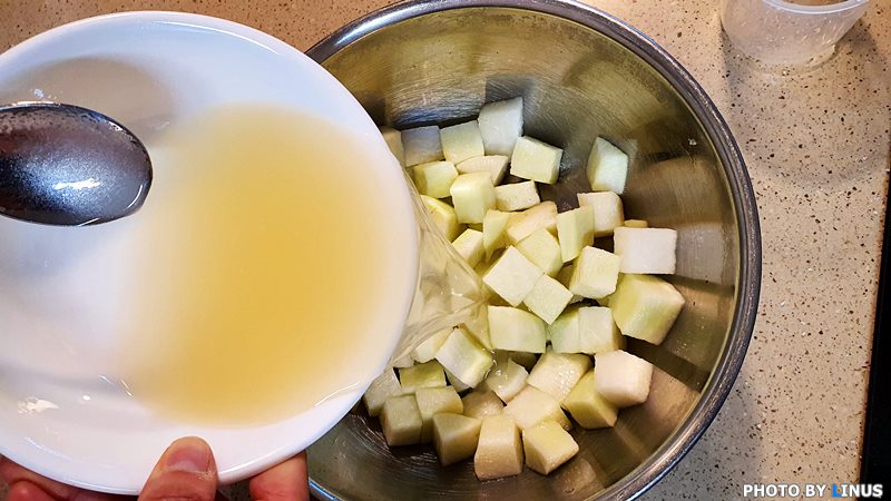 무와 식초+설탕물을 잘 버무려준다.