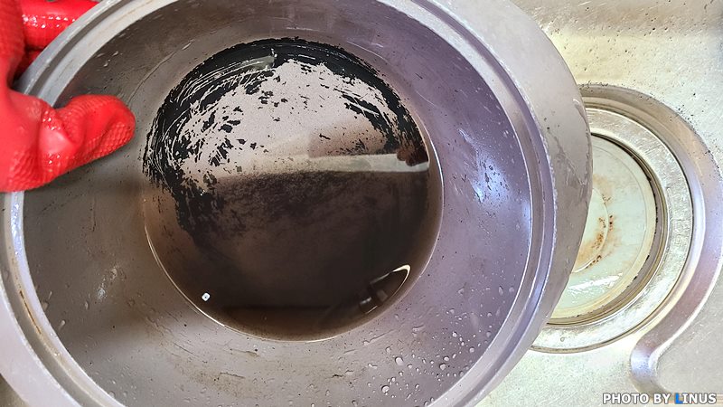 하지만 요지부동인 부분도 있다. 스테인리스 냄비는 조금 더 쉽게 벗겨졌는데 이건 코팅이 되어있어서 그런듯. 어쨌거나 그럴땐 다시 베이킹소다나 치약을 조금 뿌려서 마찰력을 높여주고...