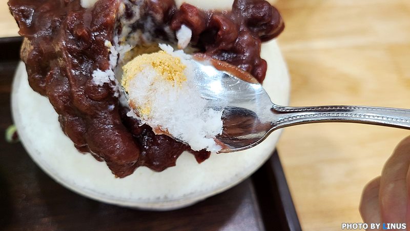 먼저 팥빙수부터. 아래에는 곱게 간 우유얼음이... 위에는 먹음직스러운 팥과 떡 2개가 올라가있다.
