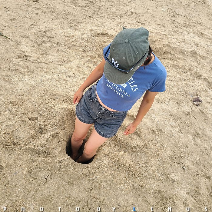 다른 아이들이 파놓은 구덩이에 쏘옥 들어간 뭉이.ㅋ 함정 수준.