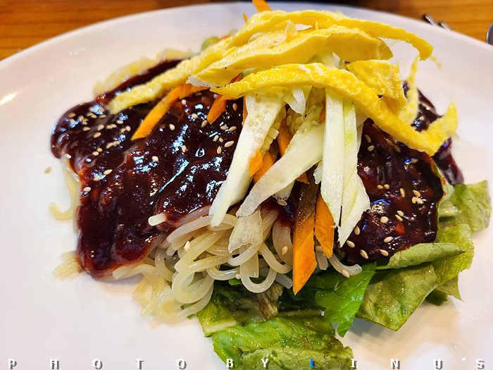 먼저 쫄면부터... 야채와 탱글한 쫄면면발, 양념에 깨가 부슬부슬 올라가있고 그 위엔 계란 지단이 올라가있다.