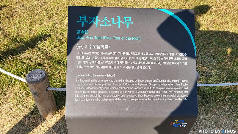 이 나무가 부자나무라 불리게 된 계기는 구인회 LG 그룹 창업주, 이병철 삼성그룹 창업주, 조홍제 효성그룹 창업주가 당시 지수초등학교 교정에 소나무를 심었는데 '부자'들이 심은 나무라하여 지금도 부자 소나무라 불리며 유명하다고... 대기업 창업주 3명이 같은 초등학교 출신이라니 거참 대단하다.ㄷㄷ;