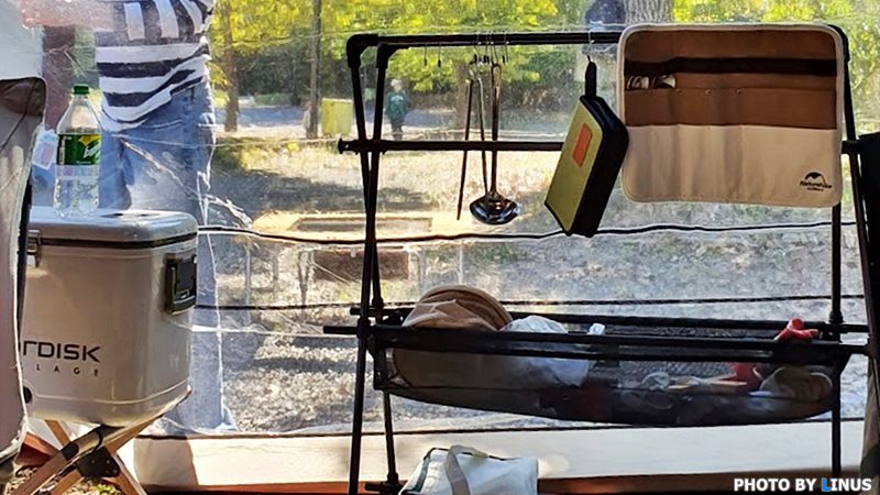 실제 캠핑가서 찍힌 몬테라 이음 행어. 찍은이 아니라 찍힌이라고 쓴 이유는 실제로 이렇게 사용하고 있기 때문... 각종 물건들을 마구(?) 올려놓고 사용한다.ㅋ 왼쪽 상단에는 숟가락 젓가락을 넣을 수 있는 수납포켓이 있고(네이처하이크), 가운데 초록색 오거나이저는 다이소에서 산 양념통 정리함.ㅋ