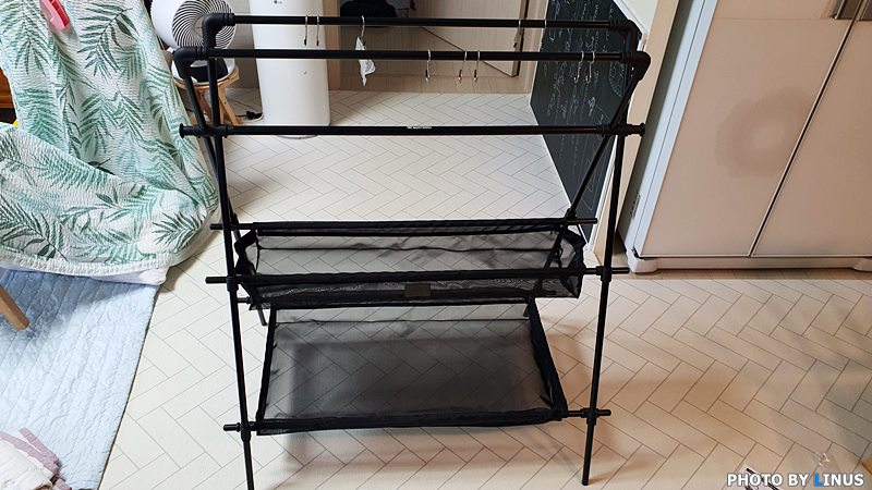위쪽 메쉬망까지 끼우고 고리까지 끼워서 완성! 5분이 채 걸리지 않은 듯하다. 이게 바로 그란데 사이즈! 이음 행어는 총 3가지 사이즈로 나와있는데 미니 행어, 일반형, 그란데형이 바로 그것. 각 사이즈별 차이는 크기도 있지만 메쉬 바스켓의 차이인데 미니 행어는 바스켓이없고 일반 사이즈는 바스켓이 하나 그란데는 바스켓이 2개다. 라이너스씨는 거거익선을 신봉하는지라 제일 큰 사이즈인 그란데로! 설치시 길이는 96 x 14 x 14 cm