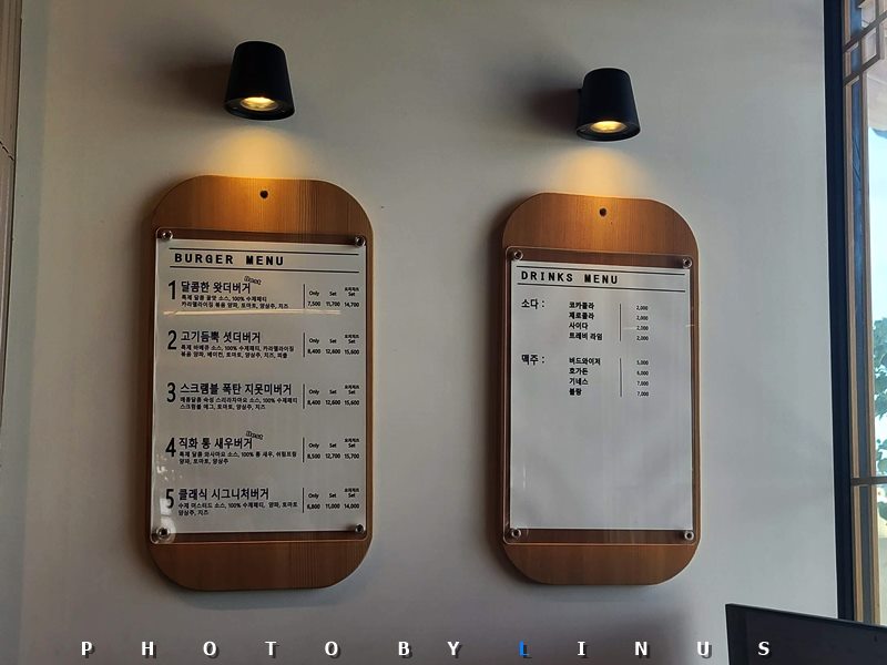 메뉴판의 모습. 버거 메뉴로는 달콤한 왓더버거, 고기듬뿍 셧더버거, 스크램블 폭탄 지못미버거, 직화 통 새우버거, 클래식 시그니처버거, 불고기버거 등이 있고, 콜라 사이다 트레비 등 탄산음료와 맥주가 있다.