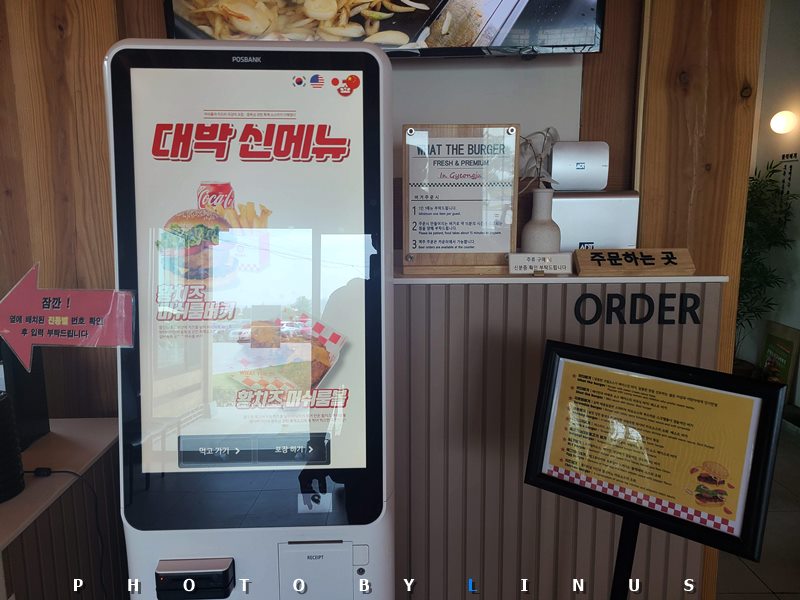 키오스크에서 주문도 가능하다. 라이너스 씨는 키오스크에서 주문을 했다. 왓더버거 세트와, 불고기 버거 세트! 포장하지않고 매장에서 식사를 하기로...