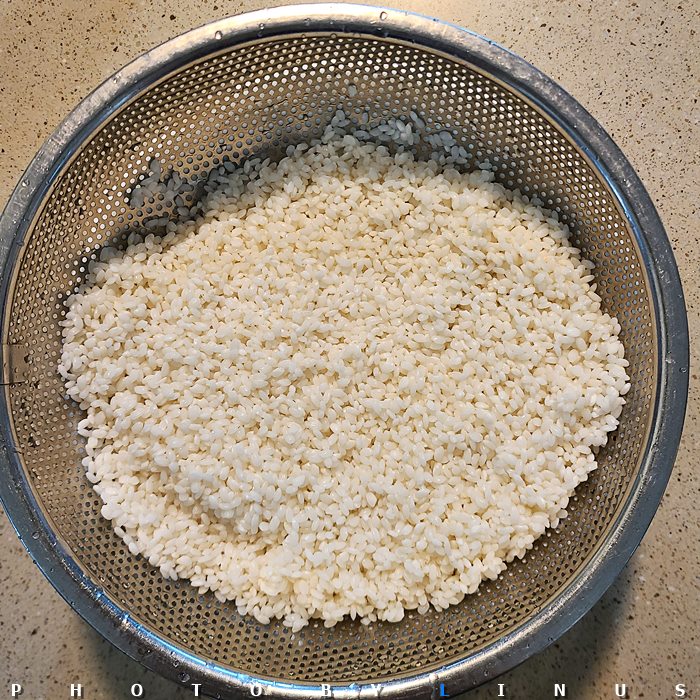 찹쌀을 채반에 밭쳐 물기를 빼주고...