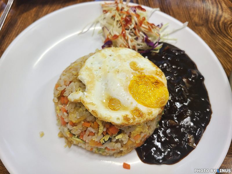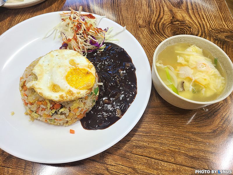 먼저 친구 A씨(?)가 주문한 볶음밥. 특유의 중국집 스타일의 볶음밥으로 볶음밥 옆에 자장소스가 있고 위에 계란이 올라가있다. 또한 계란국이 함께 제공된다.