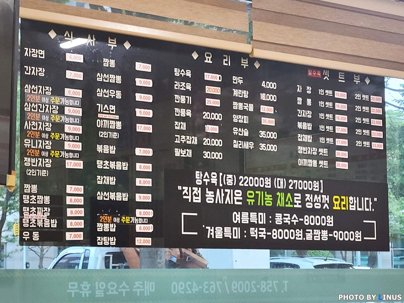 먼저 메뉴판부터... 짜장면, 간짜장, 짬뽕, 삼선짬뽕, 볶음밥, 탕수육 세트도 보이고, 팔보채, 깐풍기, 칠리새우든 어떤 요리든 기본은 한다. 특히 여름엔 콩국수를 겨울엔 굴떡국과 굴짬뽕을 계절한정 메뉴로 제공한다. 이중 라이너스씨와 라이너스 씨의 친구들이 도전한 건 볶음밥과 짬뽕, 삼선짬뽕!