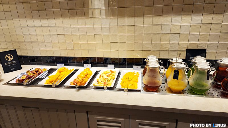 디저트 과일류. 패션프루츠, 망고, 황도 복숭아, 사과와 각종 음료수등이 보인다.