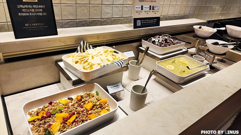입구쪽이 디저트 코너. 아직 본식사에 안들어갔지만 구경부터... 크림케이크, 초코케이크, 견과류, 카스텔라 등이 보인다.
